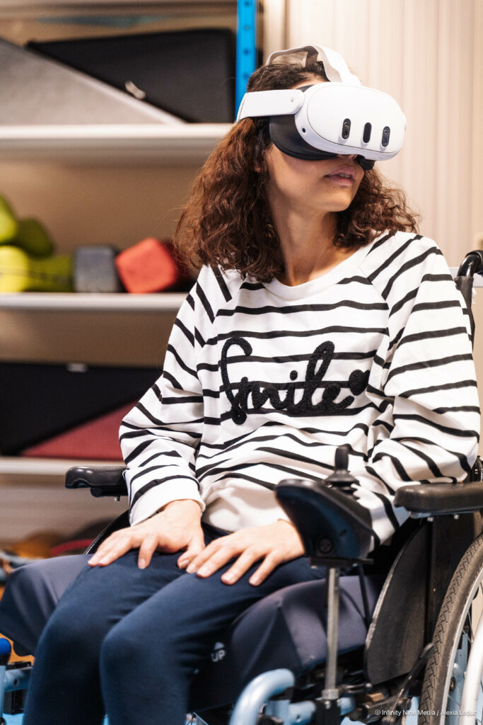 Ci-contre : La patiente en pleine expérience de réalité virtuelle au Centre Médical Germaine Revel
